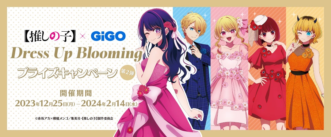 ブシロードクリエイティブは、12月25日(月)より対象のGiGOグループのお店にて『【推しの子】Dress Up Blooming プライズキャンペーン 第2弾』の期間限定イベントを開催する。