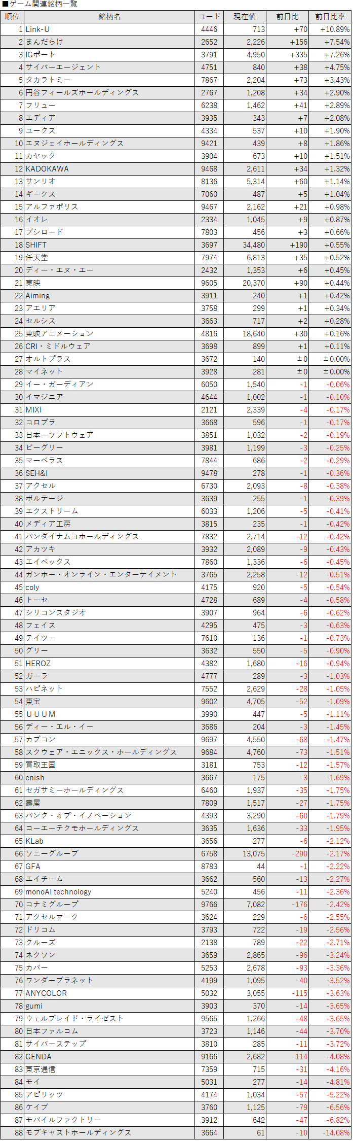 なお、ディー・エヌ・エー(DeNA)<2432>、コーエーテクモホールディングス<3635>、モブキャストホールディングス<3664>、日本ファルコム<3723>、サイバーステップ<3810>、日本一ソフトウェア<3851>、gumi<3903>、coly<4175>、バンク・オブ・イノベーション<4393>、monoAI technology<5240>、スクウェア・エニックス・ホールディングス<9684>などが年初来安値を更新した。