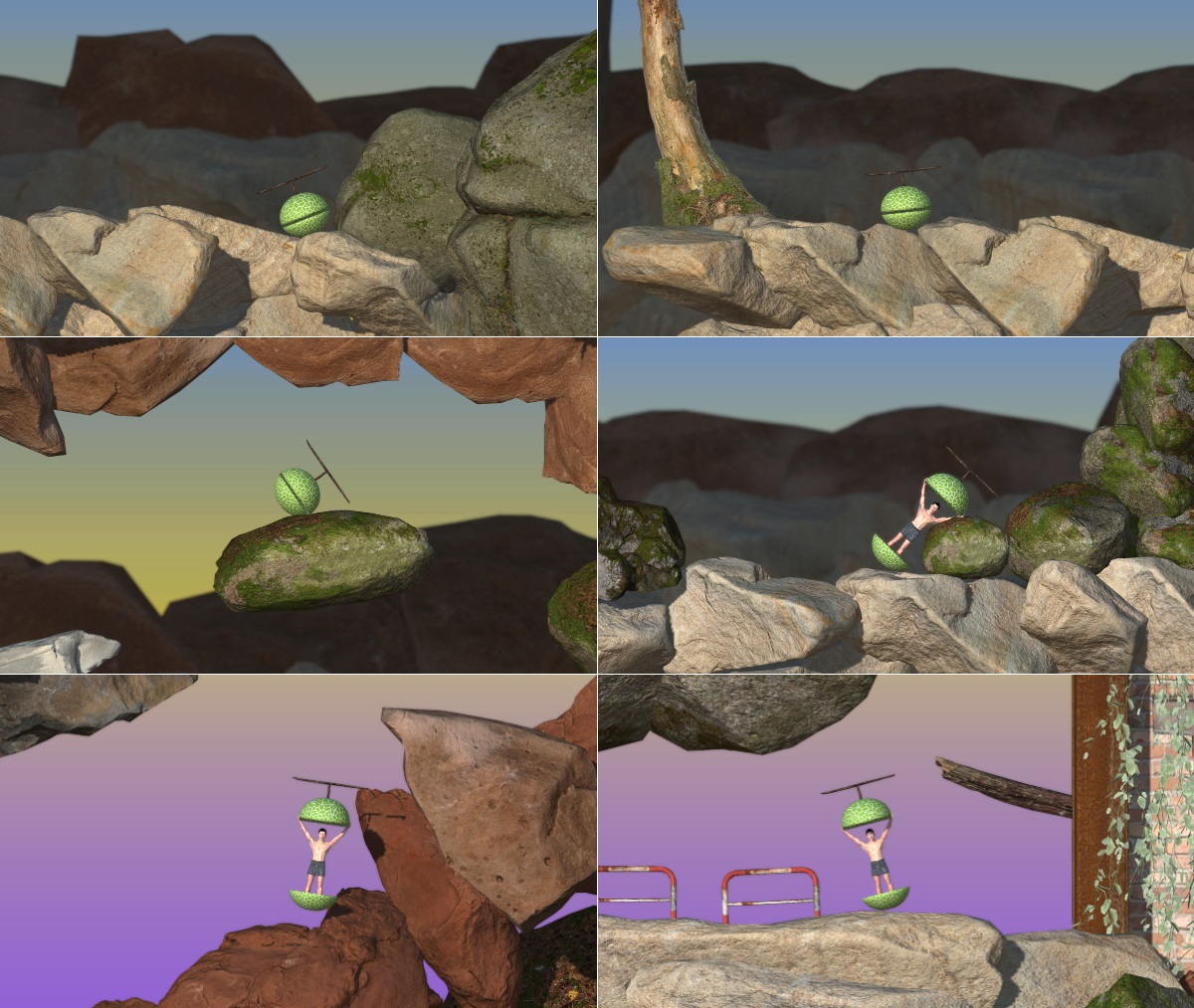 本作は、プレイヤーがメロンの中に入った人間を操作し、山を登り山頂を目指していく独創的なゲームだ。上半身と下半身のコントロールを熟練させながら、断崖絶壁や障害物を乗り越えていくことが鍵となる。