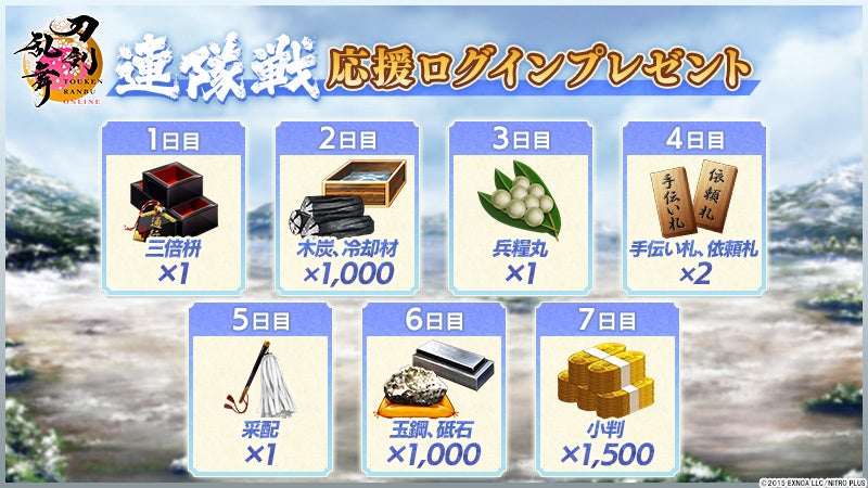 「連隊戦」の開催期間中、ゲームにログインした全ユーザーを対象に、「連隊戦」専用便利道具や資源などを最大7日(7回)プレゼント。