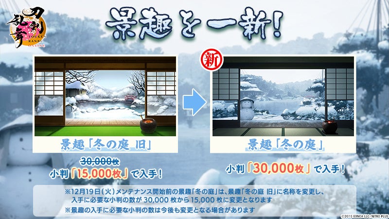 12月19日(火)メンテナンス後より、本丸の背景を彩る景趣「冬の庭」を一新した。新たな景趣「冬の庭」は、「景趣」画面の「景趣入手」より小判30,000枚を使用して入手できる。