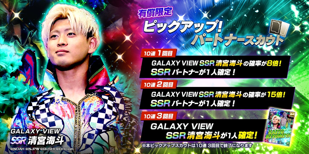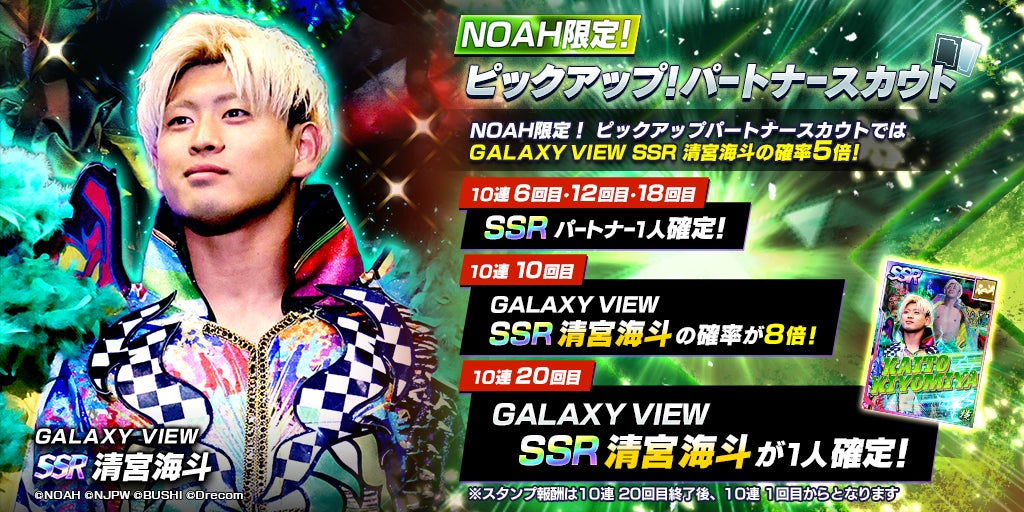 新日SSは2023年12月20日(水)メンテナンス終了後から、NOAHよりSSRパートナーとして、SSR「[GALAXY VIEW]清宮海斗」が登場する「NOAH限定!ピックアップ!パートナースカウト」を開催している。本スカウトは、10連スカウトを既定回数行うと、ラインナップに含まれるSSRパートナーからいずれか1人を確定で獲得できる仕様。また、今回初登場するSSR「[GALAXY VIEW]清宮海斗」は、ピックアップ対象として、スカウトのプレイ回数に関わらずスカウト確率が通常の5倍となっている。