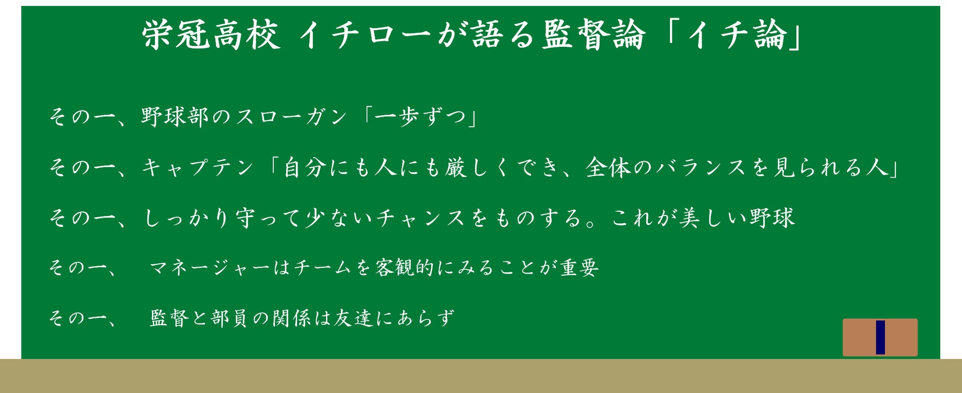 動画内では、“栄冠高校 イチロー監督”として監督論を熱弁。部のスローガンに込めた思い、キャプテンに求める素質、野球スタイル、部活を通しての成長などを語っている。