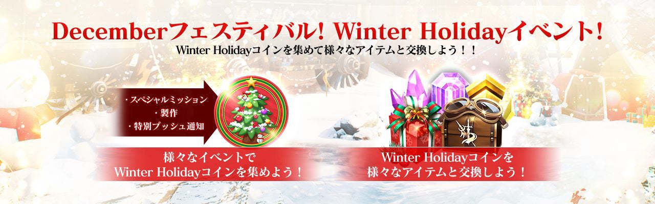 アリーナや訓練場ランキング戦などのミッションをクリアすることで、Winter Holidayコインを獲得できる。Winter Holidayコインは、地図、トパーズ、解放された装身具製作素材選択ボックスなどと交換できる。