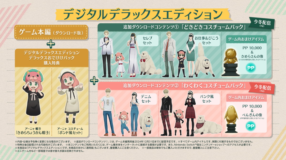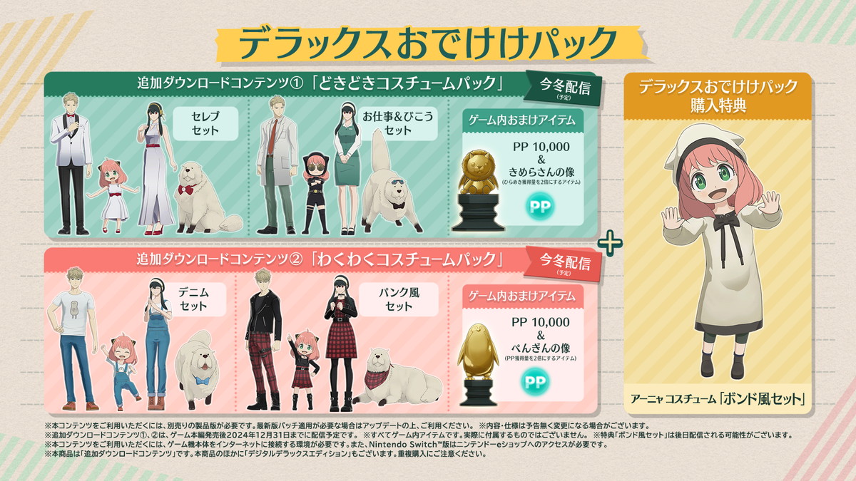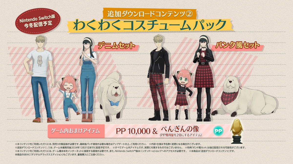本日、追加ダウンロードコンテンツ1.、2.の詳細を公開した。いずれのコンテンツも、フォージャー家のゲーム内コスチュームと、ゲーム内で使用できるアイテムがセットになった追加コンテンツとなっている。Nintendo Switch版での配信は今冬を予定している。配信日は後日公開となる。