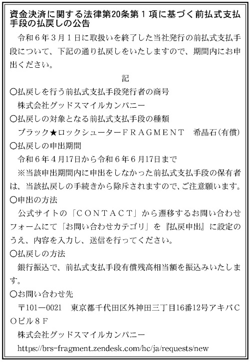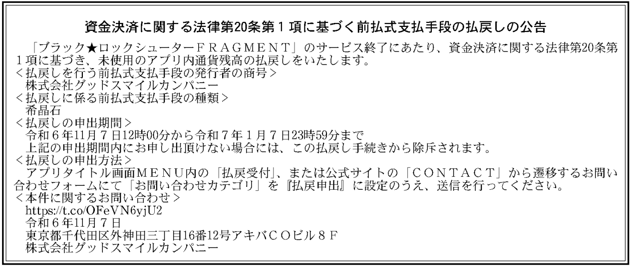 2024年11月7日付けの「官報」に資金決済法に基づく前払式支払手段の払戻しの公告が掲載されていた。