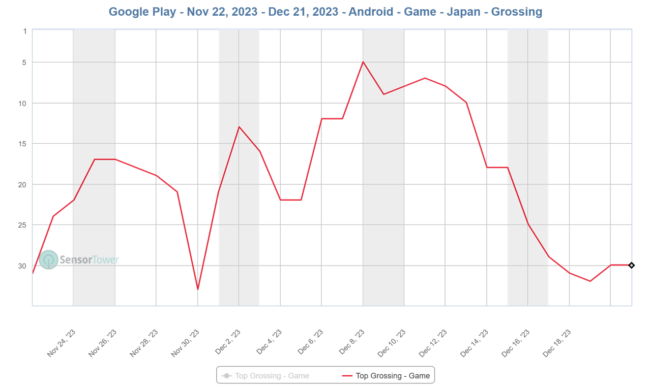 2023年12月16日~12月22日のGoogle Play売上ランキング上位の状況を振り返っていこう。まず、首位争いから見ていくと、MIXI『モンスターストライク』が12月16日に11月28日以来の首位となると、そのままポジションをキープして1週間を終えた。12月14日より「劇場版 SPY×FAMILY CODE: White」とのコラボを行っており、首位獲得の原動力となったようである。サムザップと東宝<9602>の『呪術廻戦ファントムパレード』がランキングで上昇し、App Storeと同様、首位獲得が期待されたものの、一歩及ばなかったようだ。