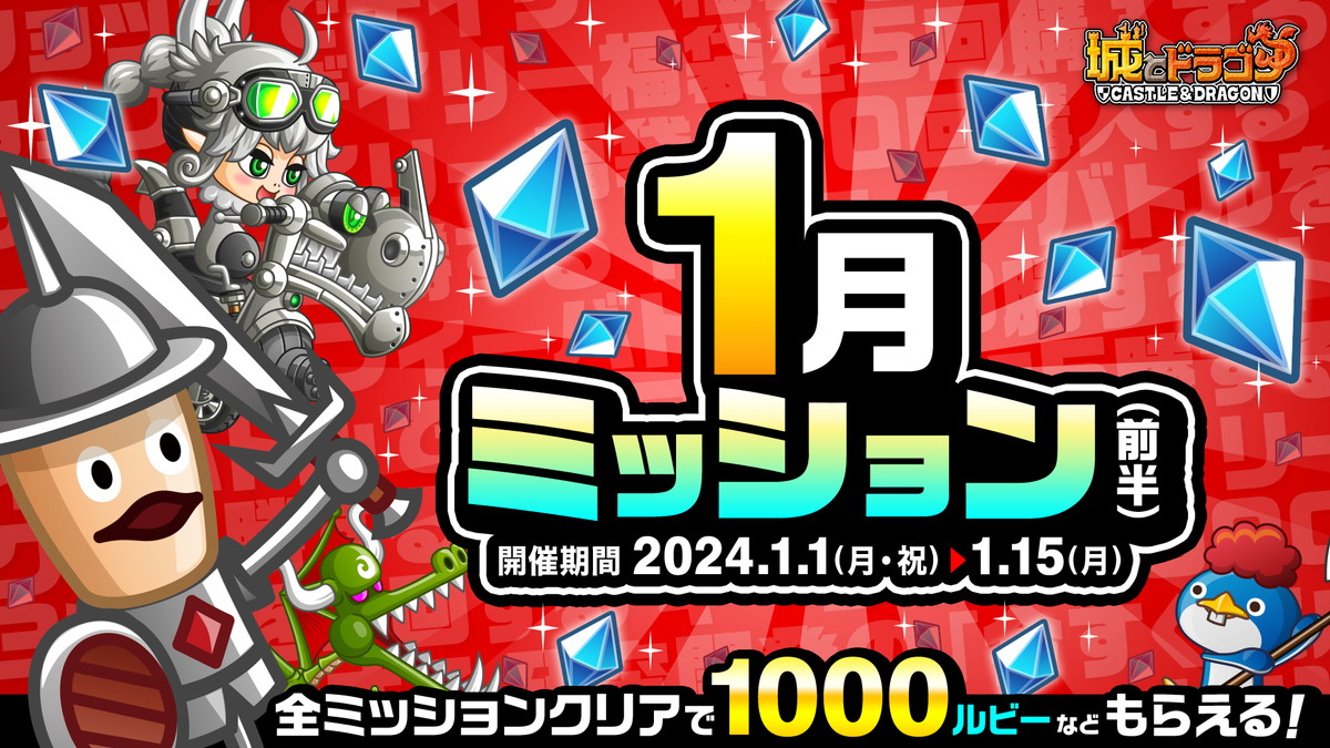 アソビズムは、『城とドラゴン』でゲームにログインするだけで最大“2024ルビー"などの豪華アイテムがもらえる「2024 あけおめログインボーナス」を2024年1月1日より開催するまた、ミッションクリアで最高 1000ルビーがもらえる「1 月ミッション(前半)」を開催。前半・後半のミッションを合わせて規定数クリアすると1000~3000 ルビーが当たる「褒美アバたま」への挑戦も可能となっている。