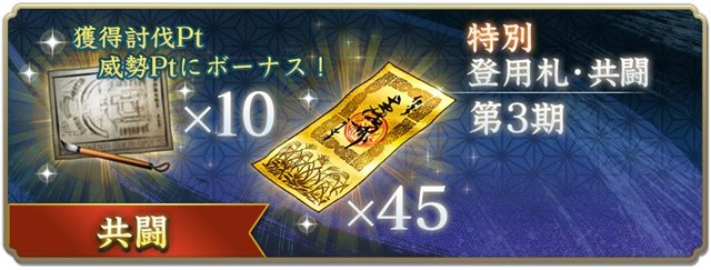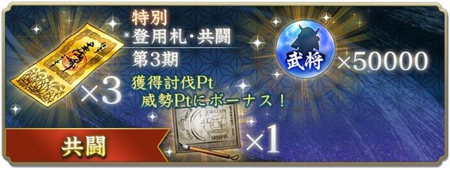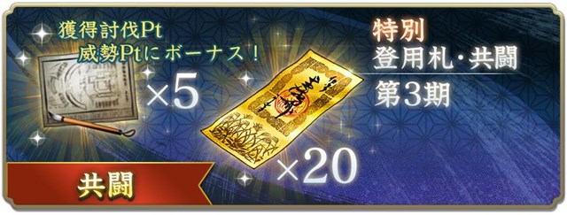 イベント期間中、ログインすることで、共闘イベントの挑戦に必要な「討伐札 第 3 期」や無償小判などのアイテムを獲得できる。