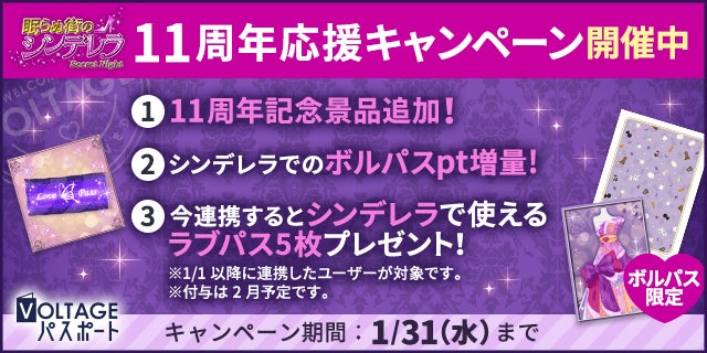 「VOLTAGEパスポート」(以下、「ボルパス」)にて「シンデレラSN」11周年応援キャンペーンを開催しております。