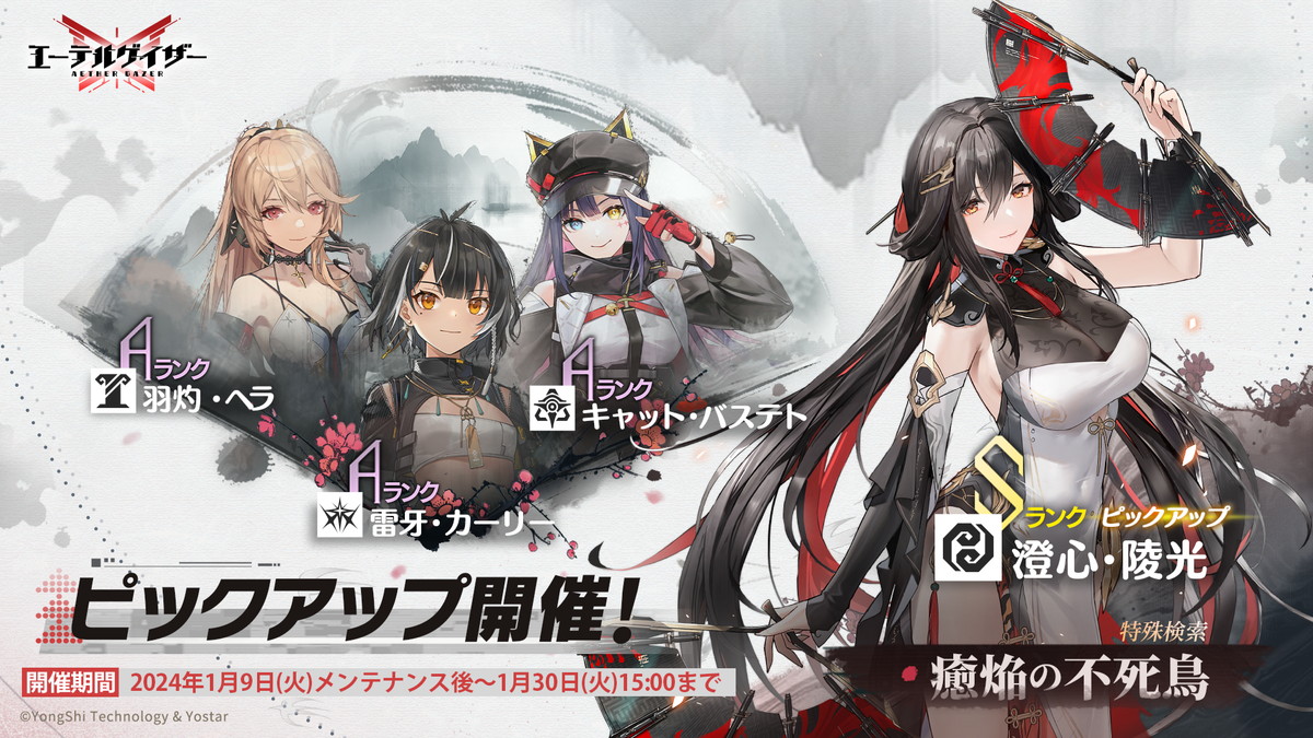 Yostarは、『エーテルゲイザー』において、1月9日メンテナンス後より、期間限定イベント「掠れし雲の歌」の開催を発表した。また特殊検索で新規実装モディファイアのSランク「澄心・陵光」(CV:三森すずこ)がピックアップ対象として登場する。