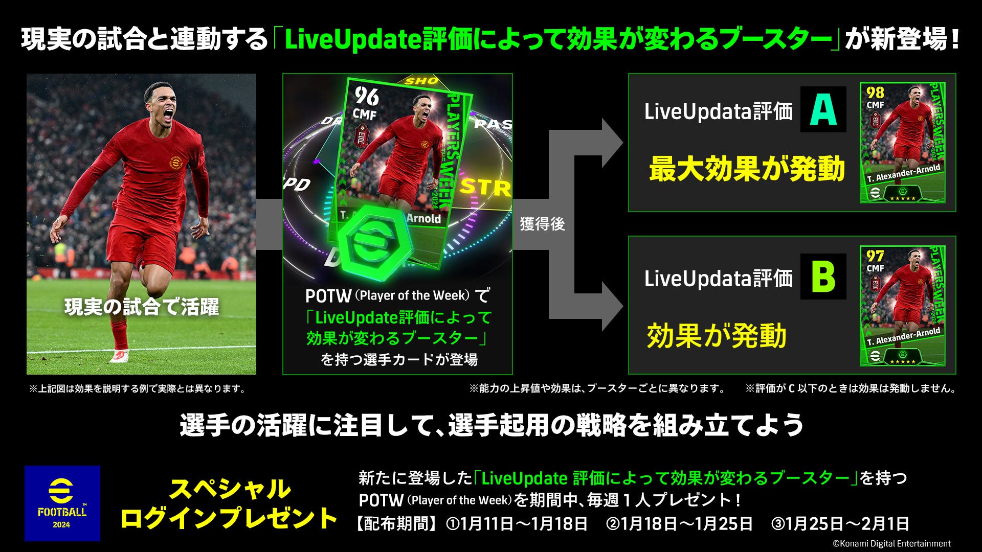 スペシャルログインプレゼントとして、新たに登場する「Live Update評価によって効果が変わるブースター」を持つPOTW(Player of the Week)を期間中、毎週1人プレゼント。