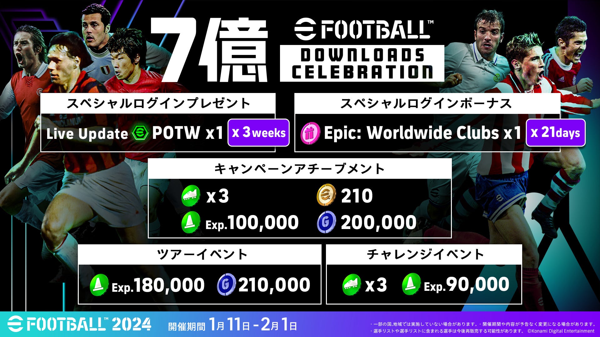 コナミデジタルエンタテインメントは、基本プレー無料で、家庭用、PC、モバイルで配信中の『eFootball(TM) 2024』が世界累計7億ダウンロードを突破したことに合わせて、ゲーム内キャンペーンを1月11日から開始した。