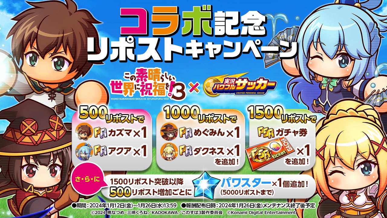 コナミデジタルエンタテインメントは、モバイルゲーム『実況パワフルサッカー』(以下、『パワサカ』)において、アニメ『この素晴らしい世界に祝福を!』とのコラボレーションを本日1月12日(金)から開始した。