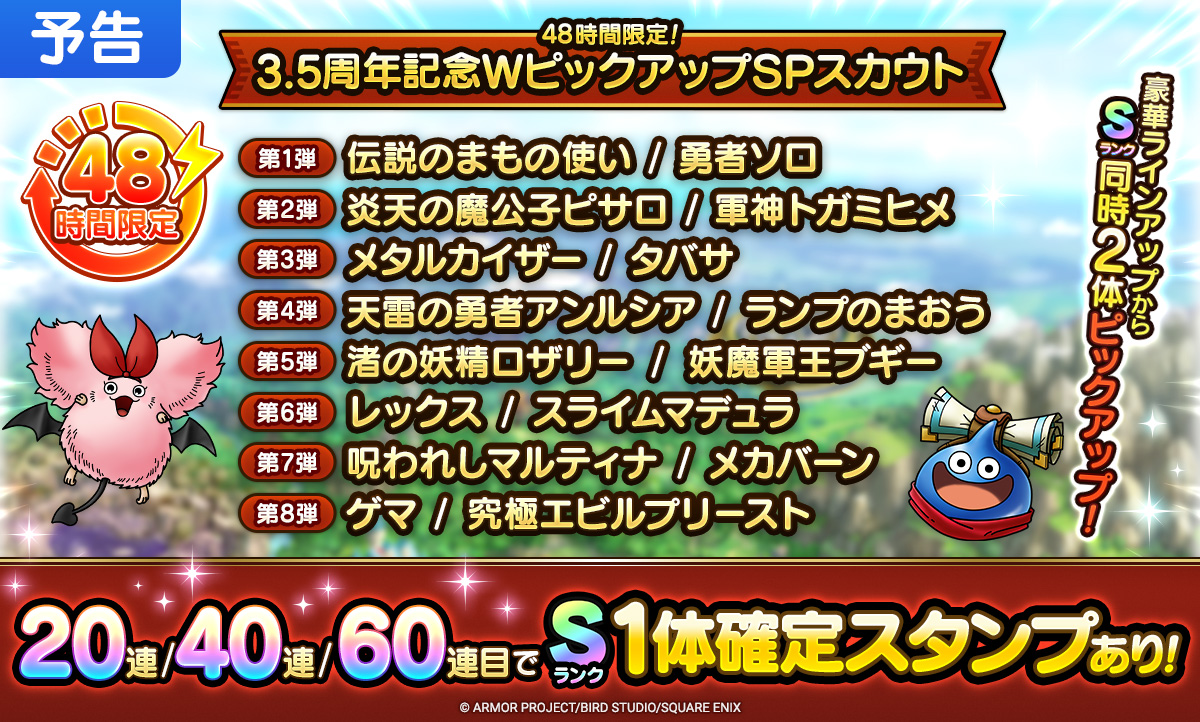 48時間限定のSPスカウトが1日ごとに登場する「48時間限定!3.5周年記念WピックアップSPスカウト」を開催する。Sランクキャラクター2体が同時にピックアップされ、20連、40連、60連でSランクキャラクター1枠確定の豪華なスカウトスタンプも付く特別なSPスカウトとなっている。