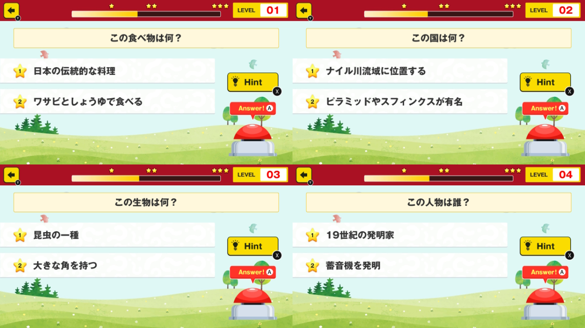 時間経過とともに1つずつ表示される3つのヒントが表す答えを、Nintendo Switchのソフトウェアキーボードで入力して答えていく早押しクイズゲーム。回答にかかった時間により最大3つまでの星が与えられるので、挑戦心をくすぐる内容となっている。