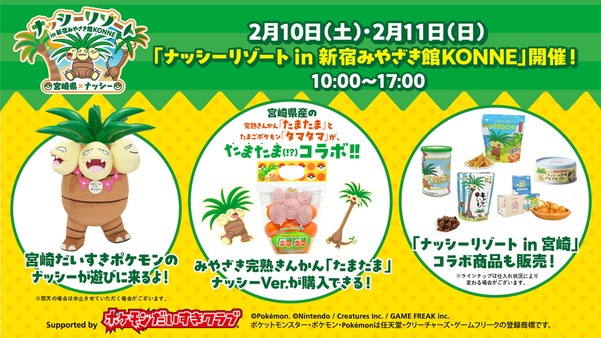 当日は、店頭で「宮崎だいすきポケモン」ナッシーが、2日で計8回のグリーティングを実施するほか、店内では宮崎県の特産品とナッシーがコラボした「ナッシーリゾート in 宮崎」コラボ商品を販売。店内で税込1500円以上購入した各日先着300名に、当イベント限定のナッシーオリジナルクリアファイルをプレゼントする。