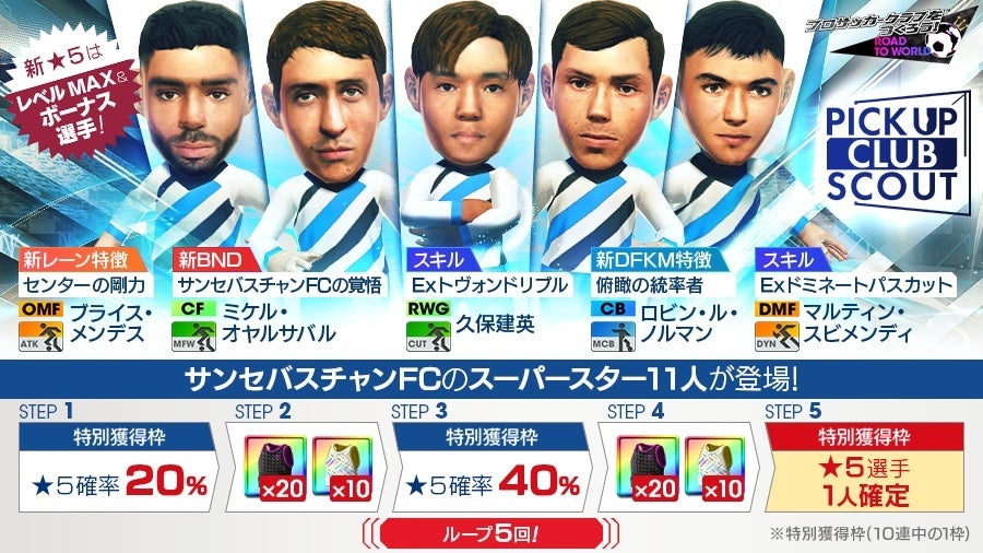 通常枠の★5出現確率が15%! STEP1・STEP3で「★5選手出現確率UP」、STEP5で「新★5選手1人確定」の特別獲得枠が付く。