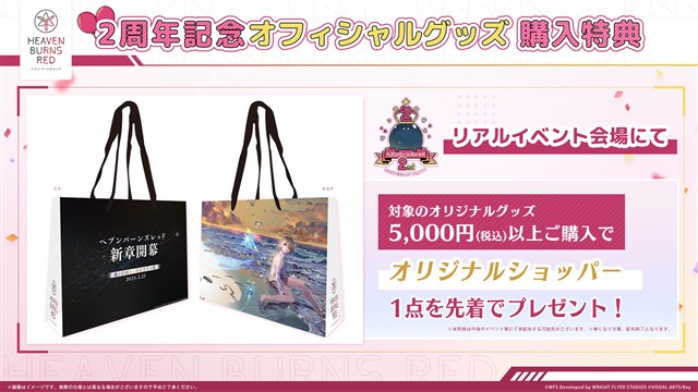 ナービィのポーチ付きブランケットやメインストーリー第五章前編キービジュアルを使用したタペストリーなど、様々な商品が登場!さらに「ヘブンバーンズレッド 2nd Anniversary Party!」のイベント会場にてオリジナルグッズを税込5,000円以上お買い上げの方にオリジナルショッパー1点をプレゼントする。
