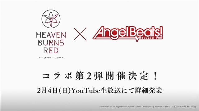 そして、『Angel Beats!』 コラボ第2弾の開催も決定!詳細の発表は2月4日「ヘブンバーンズレッド 2nd Anniversary Party!」の生放送での続報にて判明するとのこと。