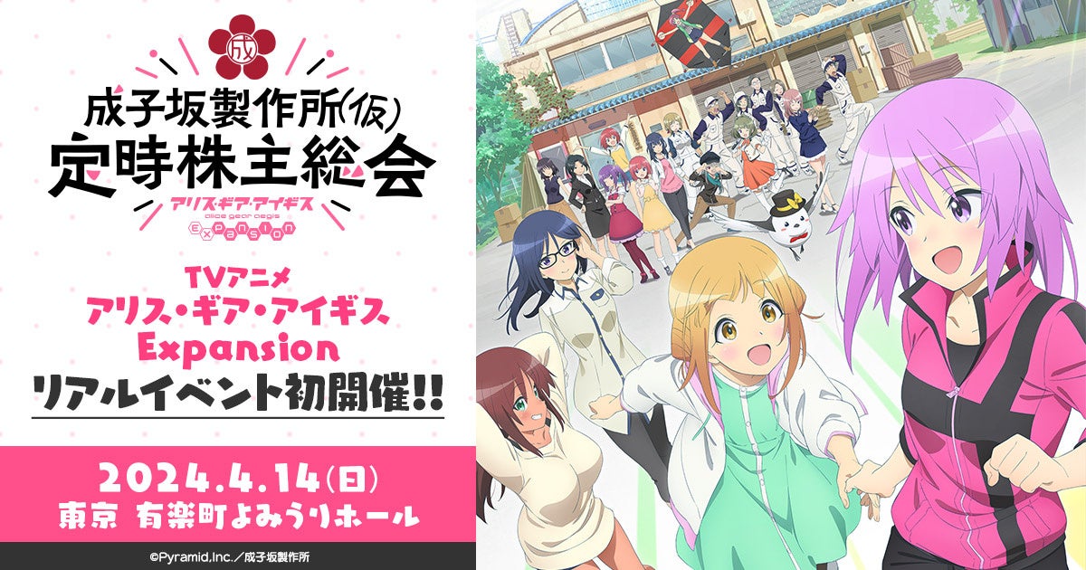 4月14日(日)に開催されます『「アリス・ギア・アイギス Expansion」成子坂製作所(仮)定時株主総会(以下、本イベント)』だが、1月20日(土)よりチケットのプレイガイド一次先行(抽選)申込が開始された。