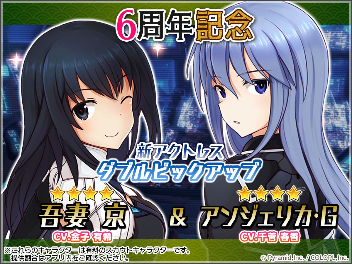 新たにプレイアブルキャラとなった「★4/吾妻 京(CV:金子 有希)」と「★4/アンジェリカ・グラズノワ(CV:千菅 春香)」の2人をピックアップしたスカウトが開催中。