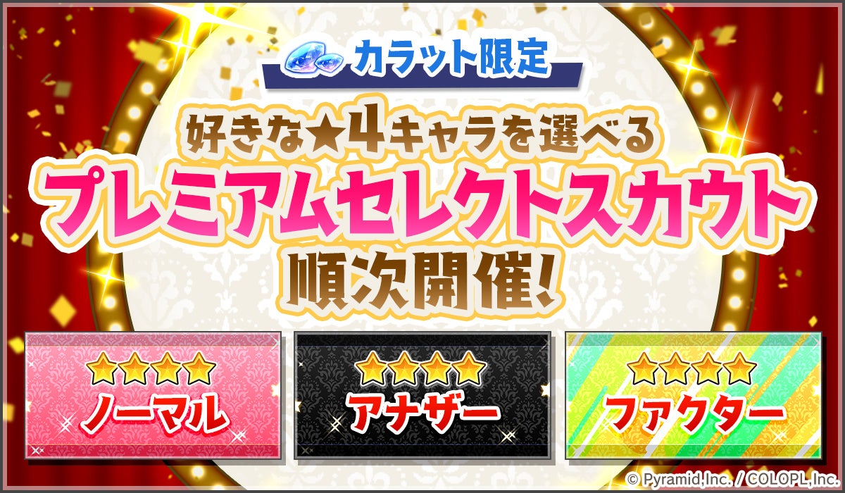 カラットを使用して1回限り、選んだ★4キャラを1人確定でスカウトできる「プレミアムセレクトスカウト」が開催中。ノーマル、アナザー、ファクターの3種のスカウトを順次開催する。