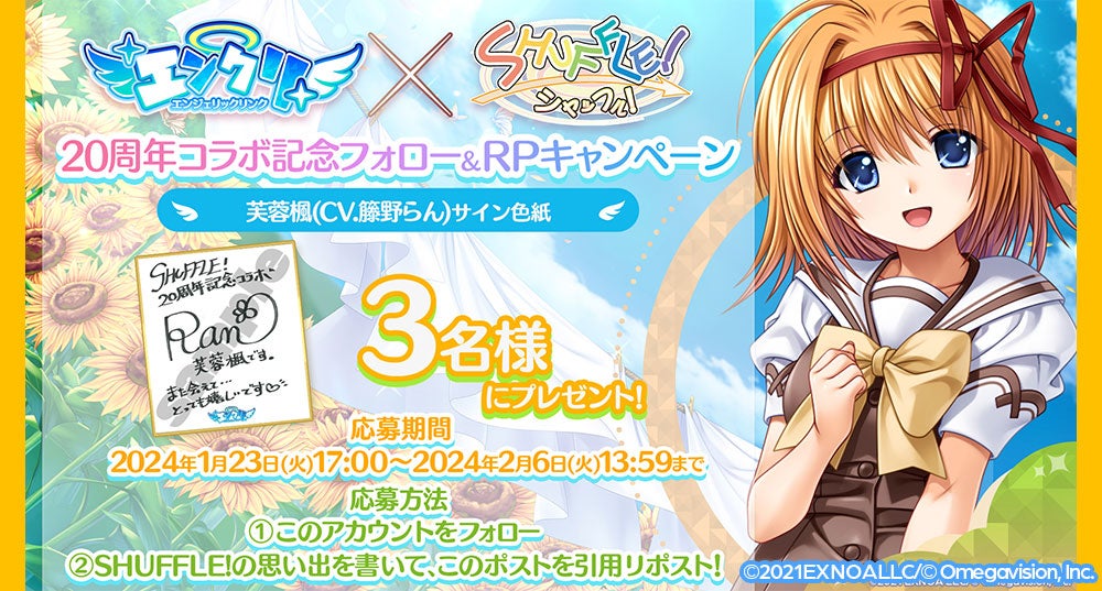 EXNOAは『エンジェリックリンク』にて、SHUFFLE!20周年を記念してコラボイベントの開催が決定したことを発表した。