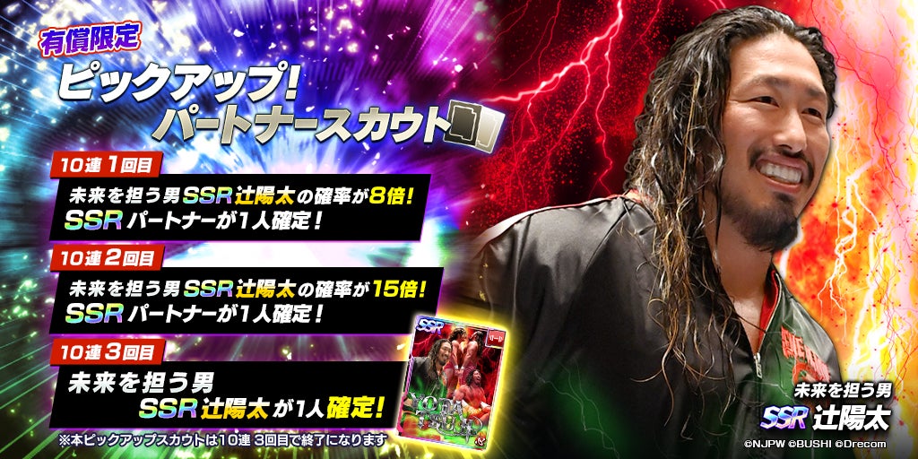 新日SSは2024年1月24日(水)メンテナンス終了後から、新規パートナーとして、SSR「[未来を担う男]辻陽太」が登場する「Battle Archives!ピックアップ!パートナースカウト」を開催。本スカウトは、10連スカウトを既定回数行うと、ラインナップに含まれるSSRパートナーからいずれか1人を確定で獲得できる仕様となる。また、今回初登場するSSR「[未来を担う男]辻陽太」は、ピックアップ対象として、スカウトのプレイ回数に関わらずスカウト確率が通常の5倍となっている。