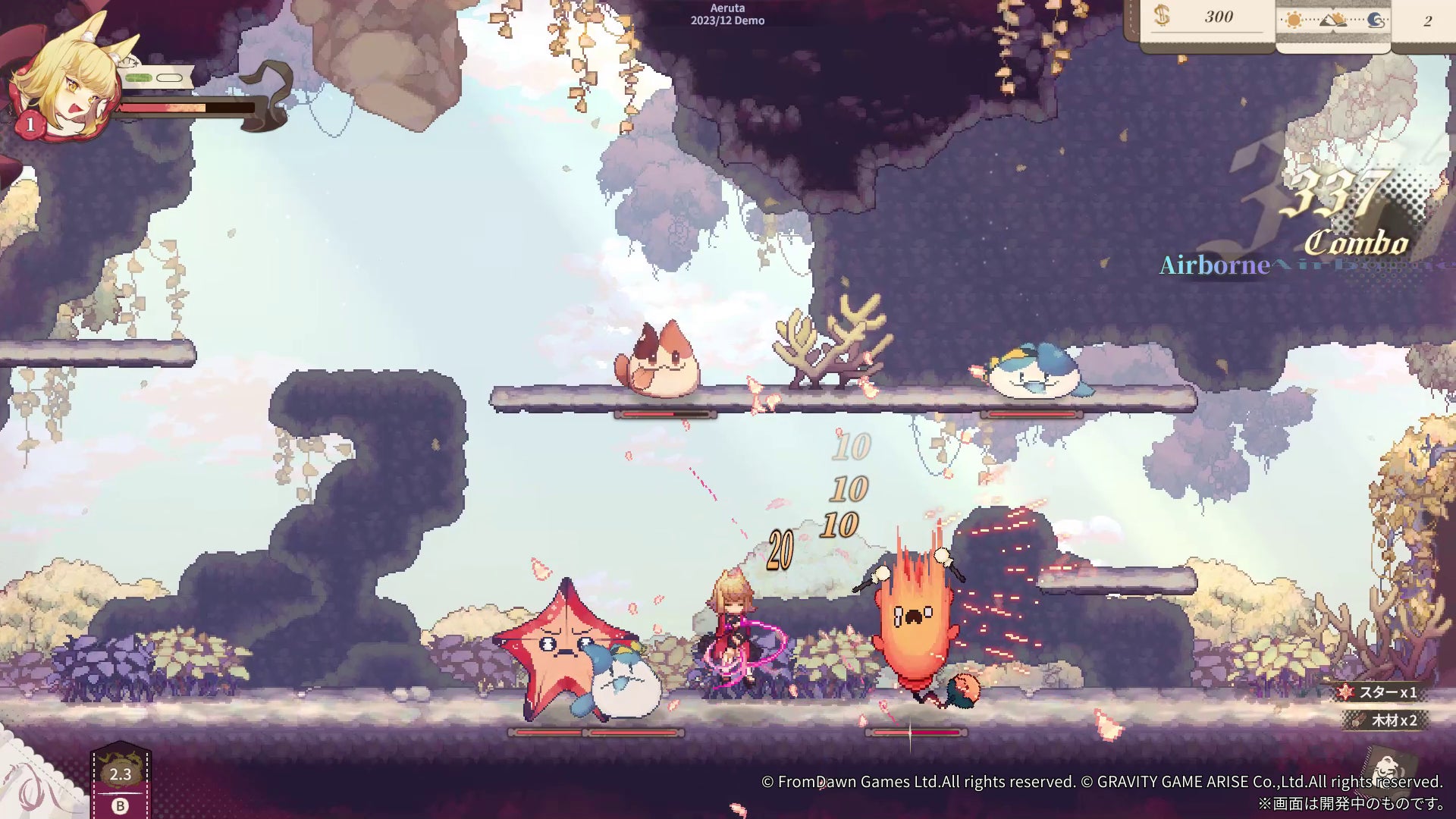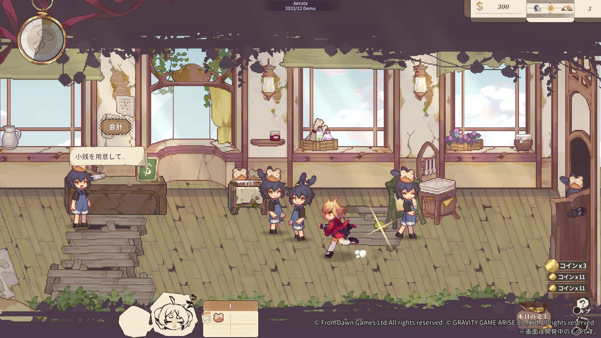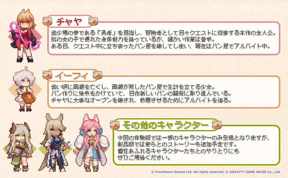 『Aeruta』は狐耳の少女「チャヤ」を操作し、島中を冒険するアクションパートと、パン屋の経営シミュレーションパート、二つのゲーム要素を併せ持ったハイブリッドRPG。今回の体験版では、オープニングから最初のステージと最奥に待ち構えるボスとのバトル、そしてパン屋での経営パートを遊ぶことができる。体験版のストーリーの続きは製品版で楽しめるので、今後の情報をお楽しみに。