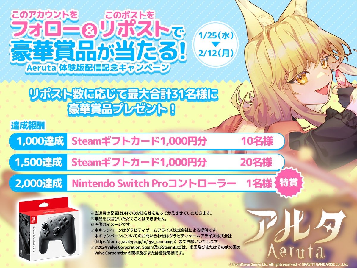 グラビティゲームアライズは、1月25日よりSteamにてダンジョン探索&パン屋経営RPG『Aeruta(アルタ)』の体験版を配信開始した。さらに、体験版の配信を記念して、公式Xアカウント(@Aeruta_official)にてフォロー&リポストキャンペーンも開始した。