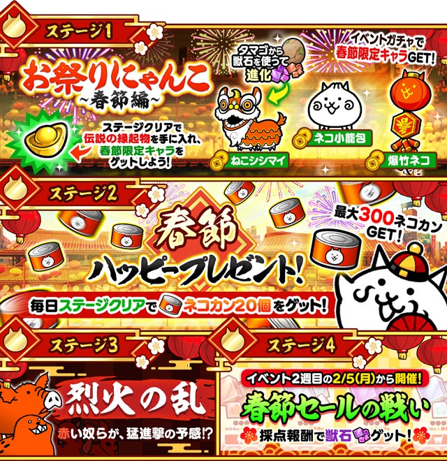 他にも毎日クリアでネコカンが入手できる「春節ハッピープレゼント!」や、赤い敵たちが続々と襲撃する「烈火の乱」も登場する。イベント2週目からは獣石が手に入る新ステージ「春節セールの戦い」が登場。