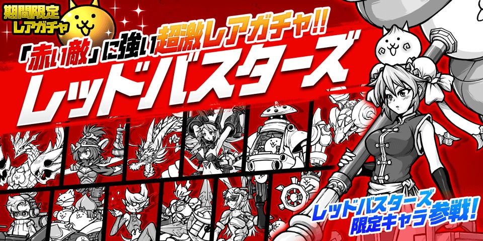 赤い敵に強い超激レアキャラクターが集結した限定レアガチャ「レッドバスターズ」を開催。この機会に、赤い敵に強いキャラクターをゲットしよう。
