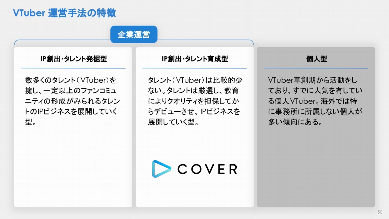 この話題の流れから、IPビジネスにおけるVTuberの強みについても語られた。VTuber運営の手法は大きく分けて個人型と企業運営型の2種類があり、さらに企業運営型の中にはタレント発掘型とタレント育成型に分けられる。カバーとANYCOLORの違いはここにあり、カバーはタレントを厳選し、教育によりクオリティを担保してからデビューさせるタレント育成型を主軸にしている。一方ANYCOLORは、数多くのタレントを擁し、一定以上のファンコミュニティの形成がみられるタレントのIPビジネスを展開するタレント発掘型をとっている。