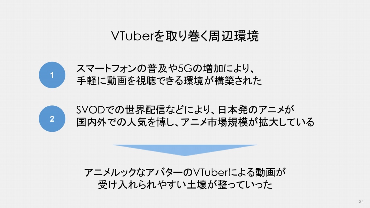 「VTuberが趣味」と回答するボリュームゾーンは、10~30代の男性と、10~20代の女性。さらに民間調査によるZ世代のトレンドランキングには、『呪術廻戦』『【推しの子】』【モンスターストライク】などに混じってにじさんじ、ホロライブもランクインしたという。