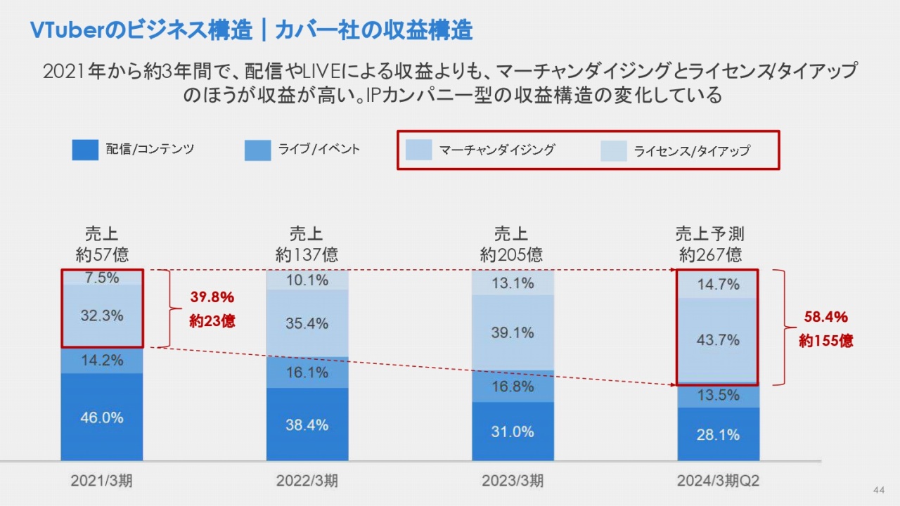 VTuberといえばYouTubeのスーパーチャットに代表される”投げ銭”のイメージが強いが、谷郷氏によると事業としてメインの収益ではないという。ビジネス構造は年々変化しており、2024年3月期の第2四半期で、マーチャンダイジングとライセンス/タイアップが全体収益の58.4%と、配信やLIVEによる収益を上回った。サンリオのような、IPカンパニー型の収益構造に変化したのだ。