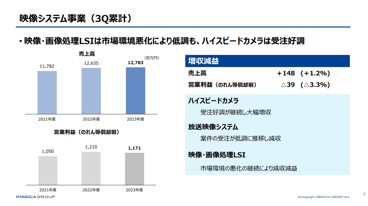 ハイスピードカメラは、受注が好調に推移したことで大幅な増収となった。一方、放送映像システムは、案件の受注が低調に推移し減収となった。光学計測は若干の増収となるも、映像・画像処理LSIについては、引き続き市場環境の悪化などにより減収減益となった。