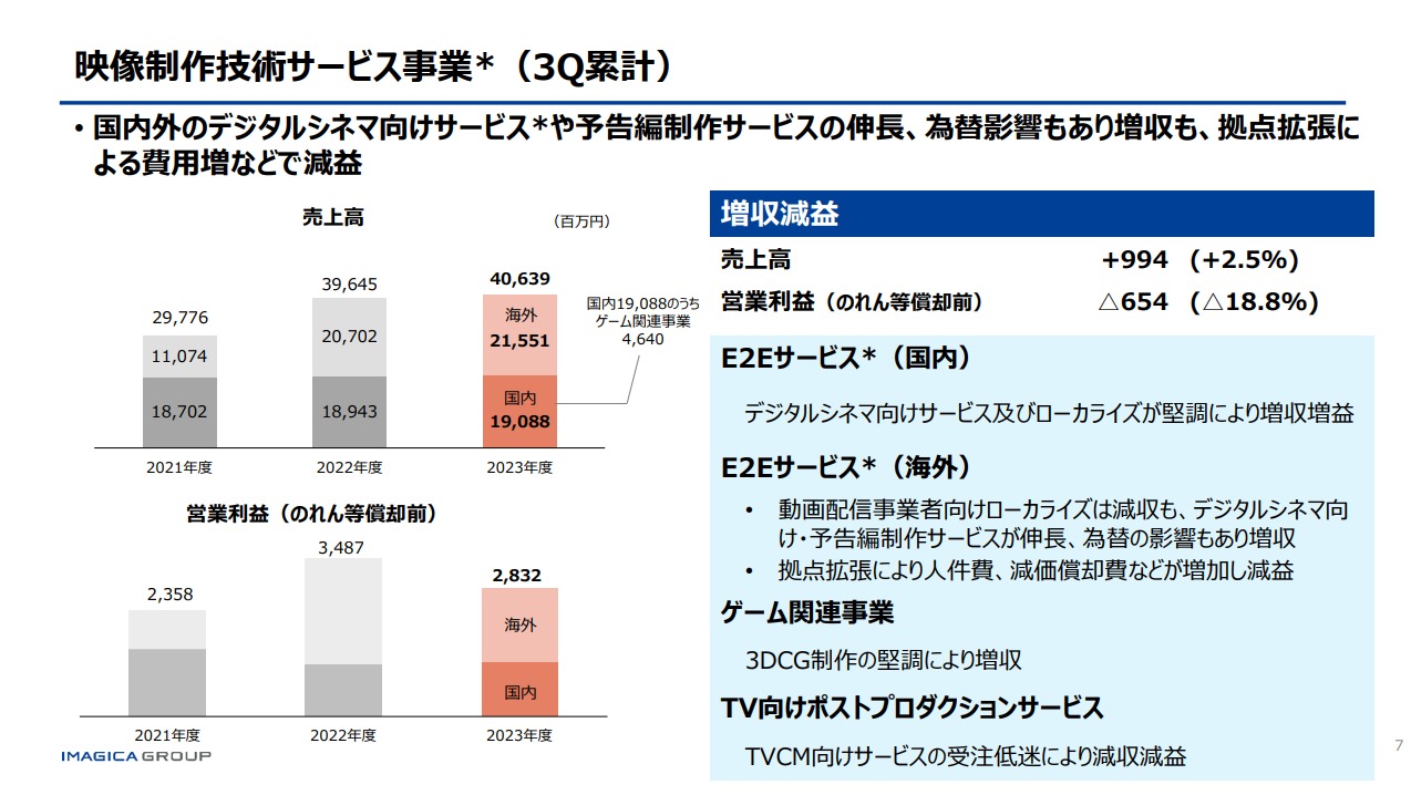 海外のE2Eサービスは、動画配信事業者向けの旧作品ローカライズ需要が一巡したことにより減収となる一方、劇場公開作品の増加に伴うデジタルシネマ向けサービスや予告編制作サービスが伸長し、さらに為替の影響もあり増収となったが、拠点拡張により人件費、減価償却費などが増加し、減益となった。