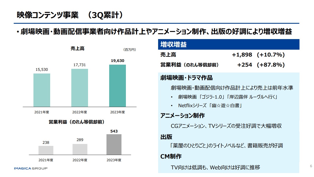 劇場映画・ドラマ作品は、5月公開映画「岸辺露伴 ルーヴルへ行く」、11月公開映画「ゴジラ-1.0」、及び12月配信のNetflixシリーズ「幽☆遊☆白書」をはじめとした劇場映画や動画配信事業者向けの大型作品を計上し、前年同期並の売上高となった。アニメーション作品は、CGアニメーションやテレビシリーズの受注が好調なことにより大幅な増収となった。
