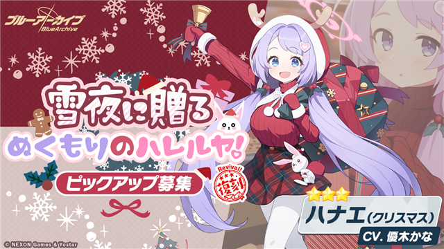 2月7日メンテナンス後より、復刻ピックアップ募集「雪夜に贈るぬくもりのハレルヤ!」、復刻ピックアップ募集「聖夜に響く慈愛のキャロル」を開催する。聖夜の救護騎士団の活動に合わせて、相応しい格好へと着替えた「ハナエ(クリスマス)」と、「セリナ(クリスマス)」のピックアップ募集になる。