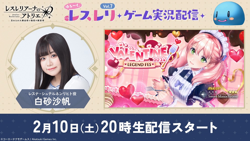 明日2月10日20時より「ゆる~く、レスレリゲーム実況配信 Vol.7」を放送予定。今回は主人公の一人であるレスナ・シュテルネンリヒト役を演じる白砂沙帆さんが出演し、ユーザーとコミュニケーションをとりながら『レスレリアーナのアトリエ』をプレイする。