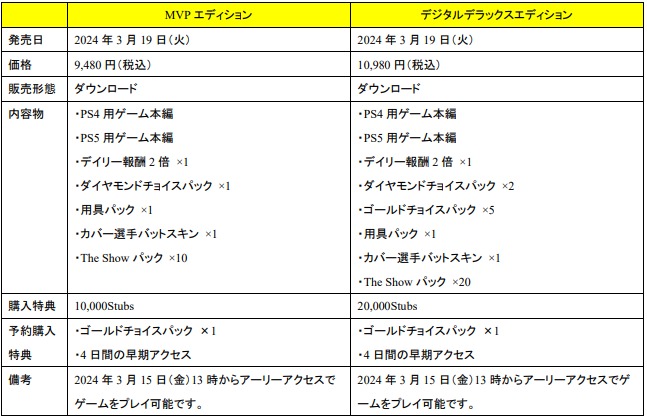 ソニー・インタラクティブエンタテインメント(SIE)は、PlayStation5(PS5)/PlayStation4(PS4)用ソフトウェア『MLB The Show 24』(英語版)MVP エディションおよびデジタルデラックスエディションを日本国内に向けて2024年3月19日に発売する。MVP エディションおよびデジタルデラックスエディションは PlayStationStore(PS Store)で予約購入を受付中。これらのエディションを予約購入すると、ゲーム本編へのアーリーアクセスが可能となり、2024年3月15日13時よりいち早く本作をプレイできる。