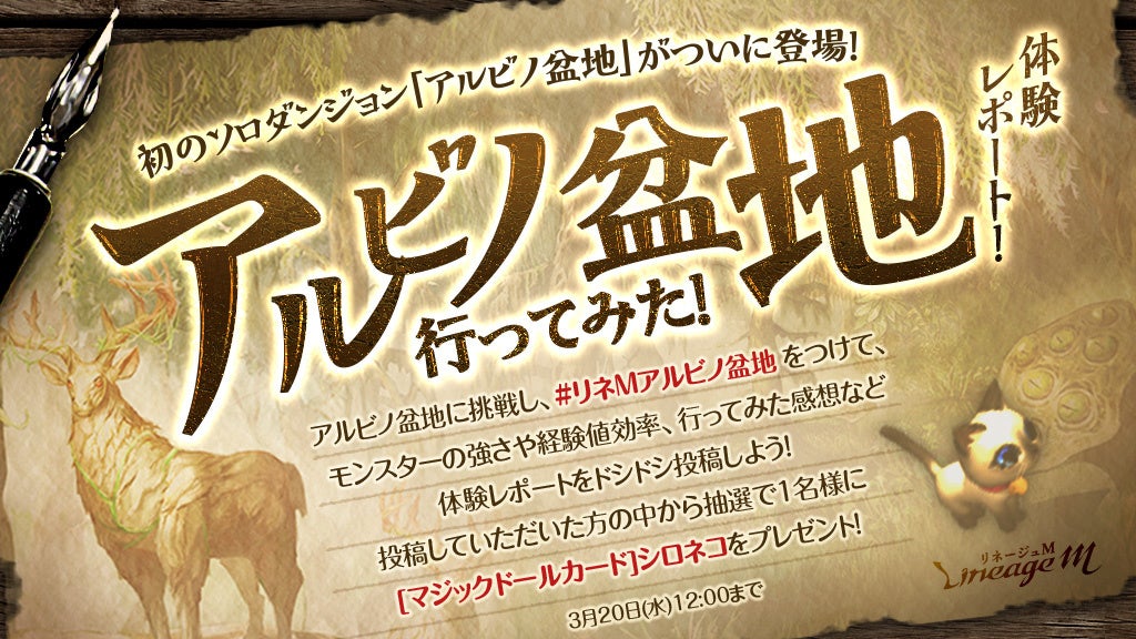 「リネージュM公式アカウント( https://x.com/LineageM_JP )」をフォローして、指定ハッシュタグ「#リネMアルビノ盆地」をつけて「アルビノ盆地」に挑戦した感想をポストすると応募完了となります。