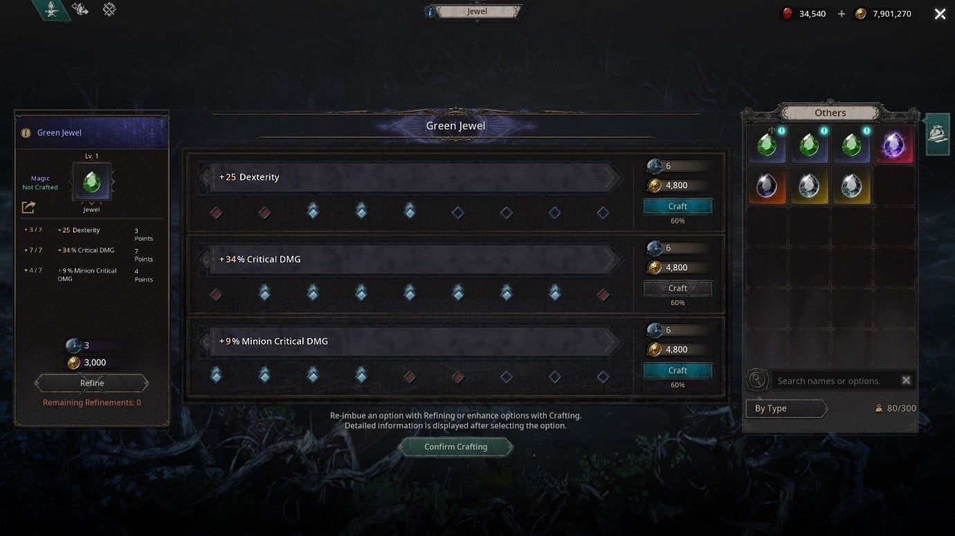 「宝石」は精錬と細工が可能です。これは「研磨石」アイテムを通じて行うことができ、装備に細工された「宝石」を装着すると既存のエンド級アイテムである「レガシー装備」より強力な能力値が備えられます。