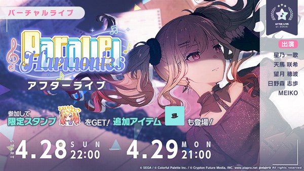 イベント終了後には「バーチャルライブ」でのアフターライブとして、「Parallel Harmonies アフターライブ」を開催する。また、「Parallel Harmonies アフターライブ」の開催に先立ち、本日からバーチャルショップにて、アクセサリ「ゴシックハット」を販売する。