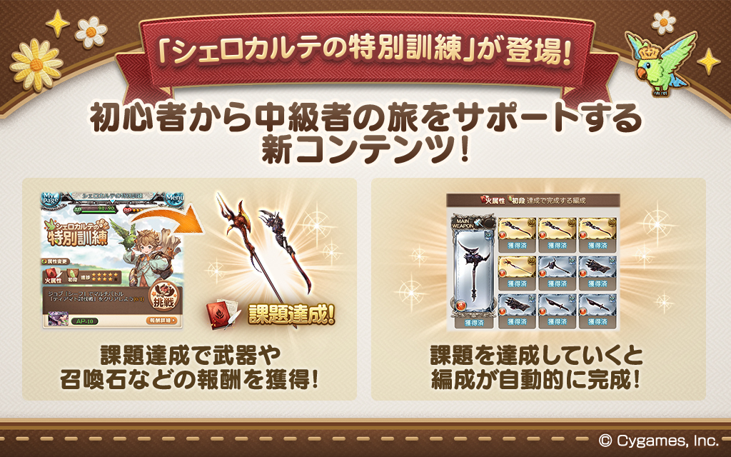 Cygamesは、王道スマホRPG『グランブルーファンタジー』について、4月23日(火)に行ったゲームアップデートにて、初心者から中級者の旅をサポートする新コンテンツ「シェロカルテの特別訓練」を実装した。