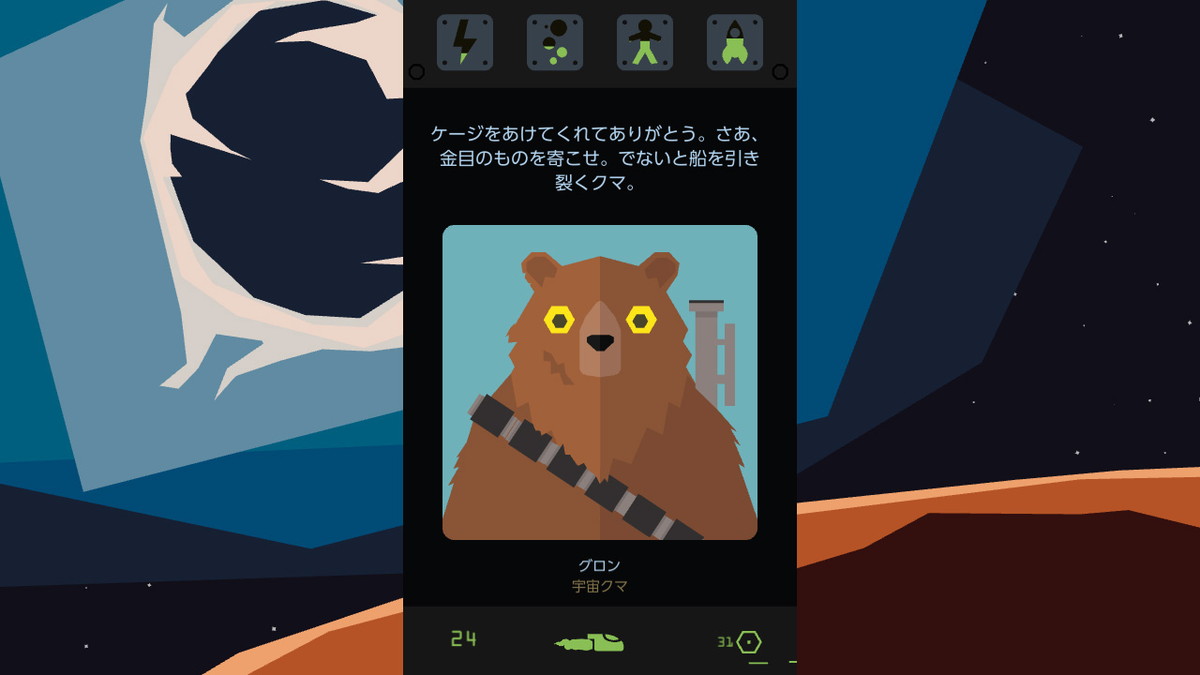◆ゲーム内には60以上のキャラクターが登場する。マネージャーのロード・シャーク、学者のストロンボ、宇宙クマのグロン……。そして、もちろんあなたの乗組員やバトルシップに搭載した頭脳派 AI など、旅の仲間はどれもユニークで魅力的。