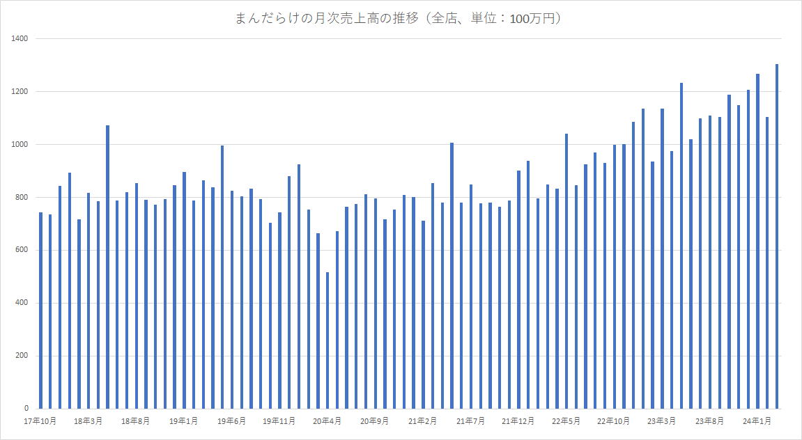 全店ベースの月次売上高の推移は以下のとおり。こちらを見ると、過去最高を更新したようだ。