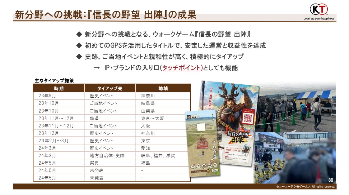 このなかでも、『信長の野望 出陣』は新しい分野となったが、同社としての大きな成果があったという。初のGPSを活用したタイトルで、安定した運営と収益性を実現したが、史跡やご当地イベントと親和性が高く、積極的にタイアップを実施したという。