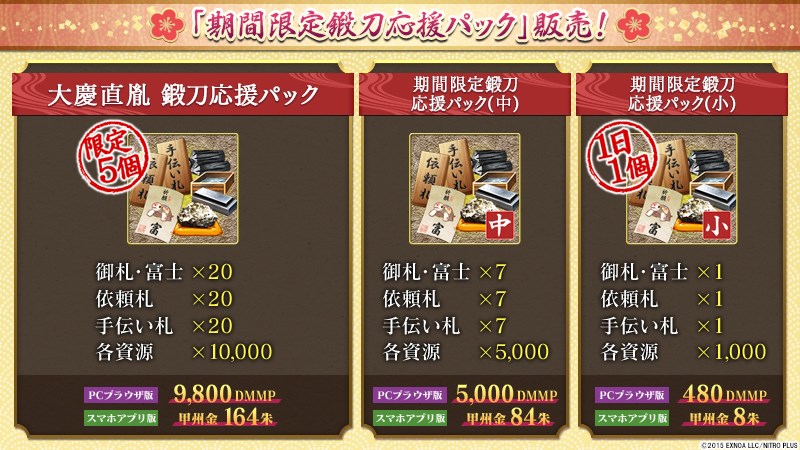 「期間限定鍛刀キャンペーン」の開催期間中、「期間限定鍛刀応援パック」を販売する。